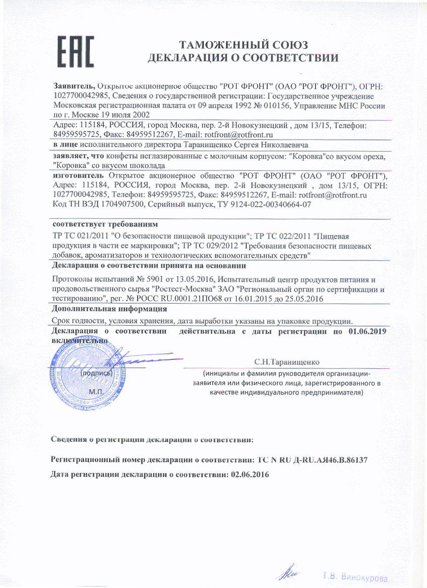Сертификат соответствия на конфеты Рот-Фронт 2019/2020