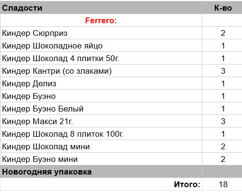 Киндер Сюрприз (3 шт), Киндер Шоколад 4 плиток 50г. (1 шт), Киндер Кантри (со злаками) (2 шт),  Киндер Делис (1 шт),  Киндер Буэно (1 шт),  Киндер Макси 21 г. (3 шт),  Киндер Шоколад 8 плиток 100г. (1 шт),  Киндер Бонс (1 шт)